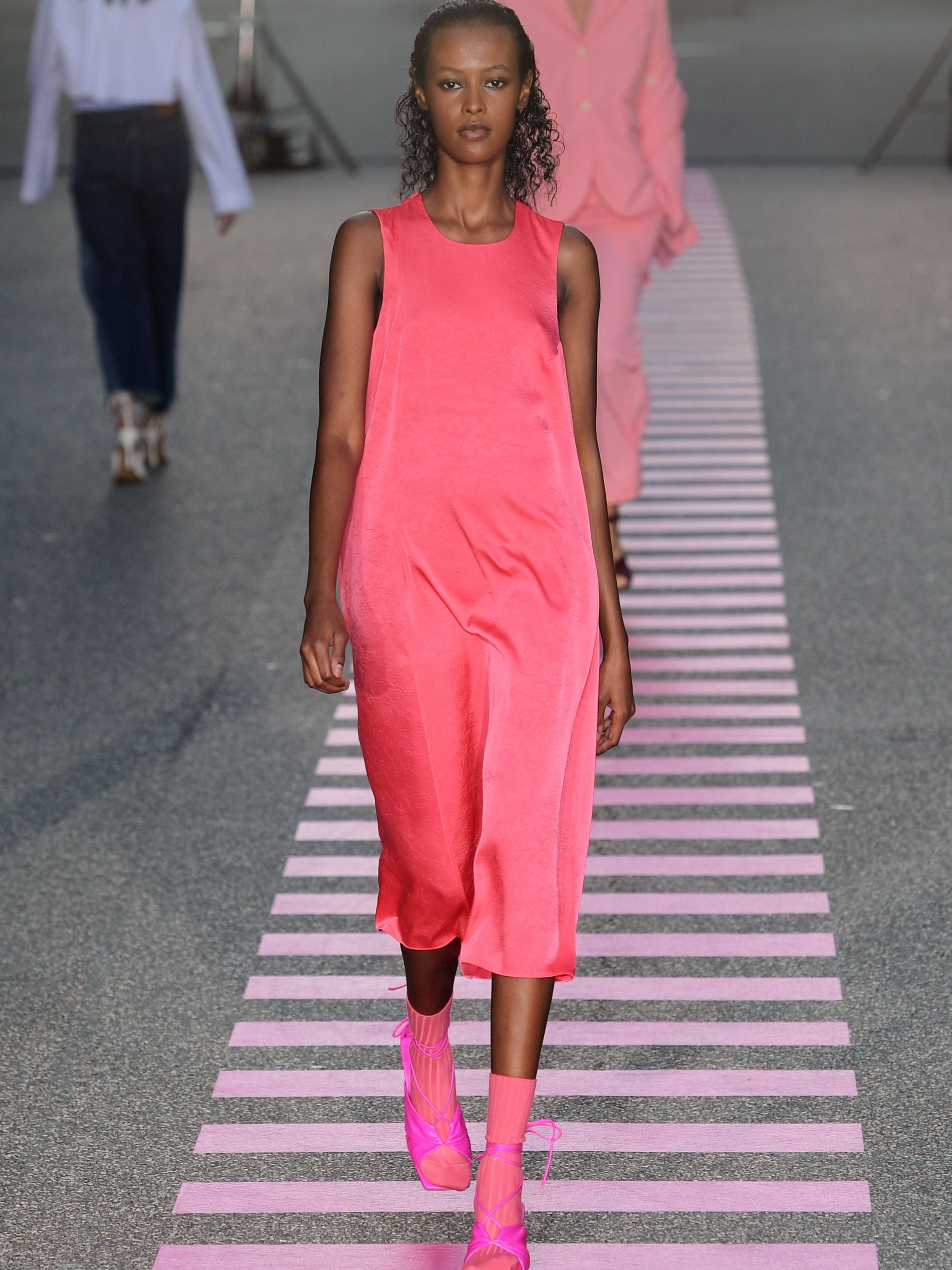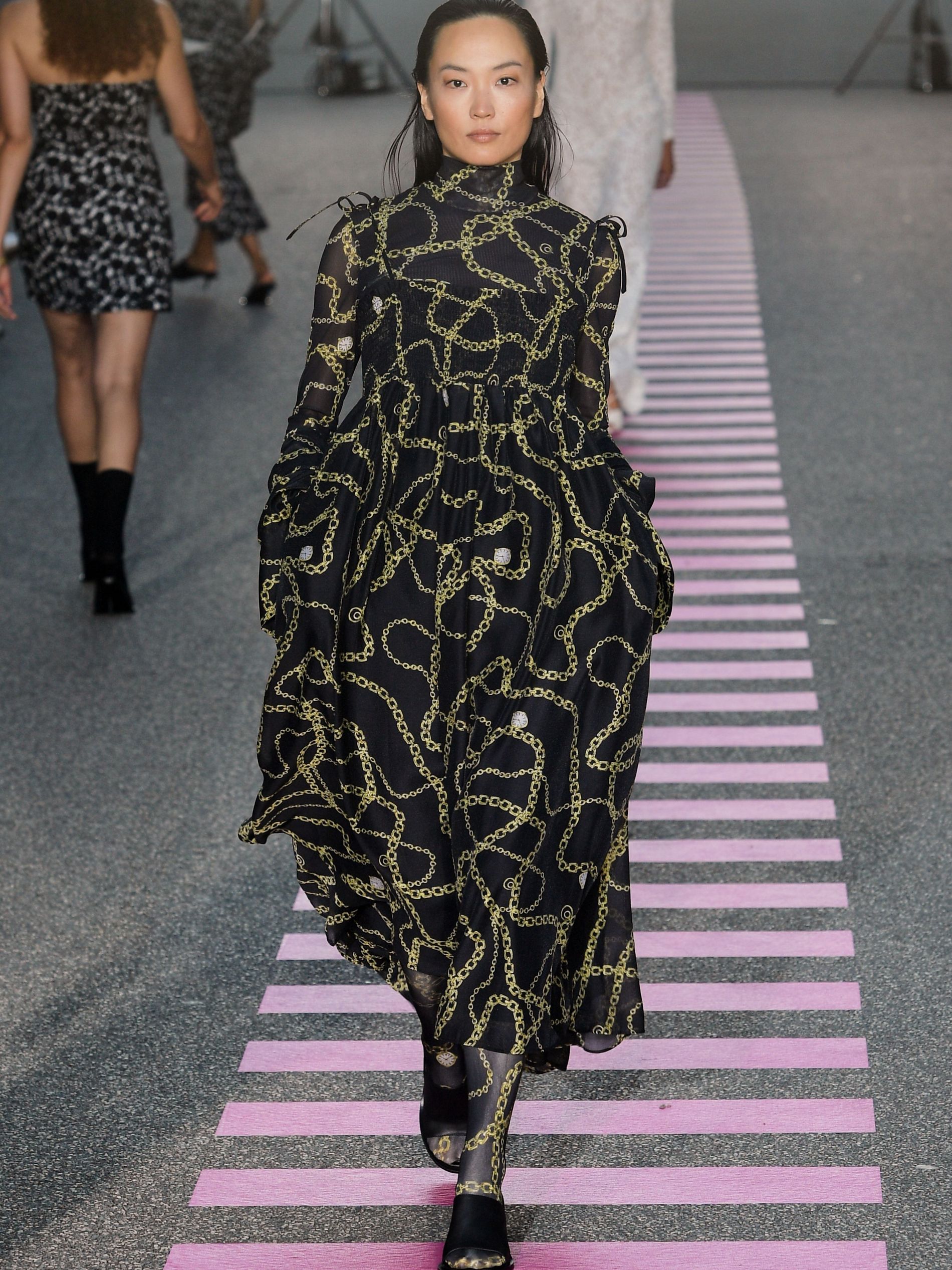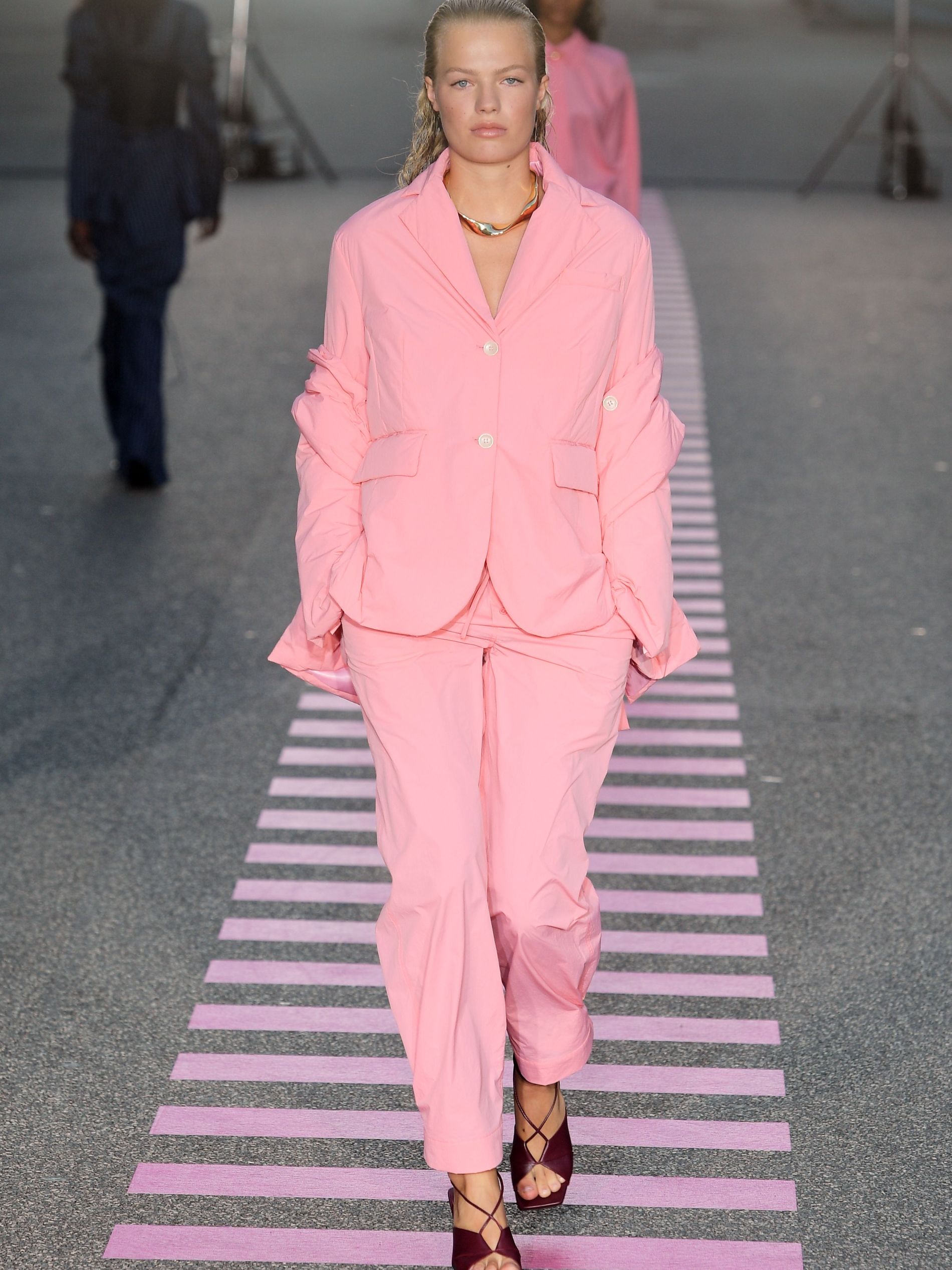In a mash-mash of historicity, bright pink terry cloth sets with swimwear bottoms were spotted alongside a 1920s organza dress with puff sleeves and a reworked empire waist, covered by postage stamp emblems calling out “Coucou de Paris” ('Hello from Paris'). "We once dedicated a full collection to Charlotte Gainsbourg," Baumgarten and Hestehave said ahead of the show. "This season we thought of, what Charlotte Gainbourg would wear if she was a Gen Z kid. It would be timeless pieces but way more bold."