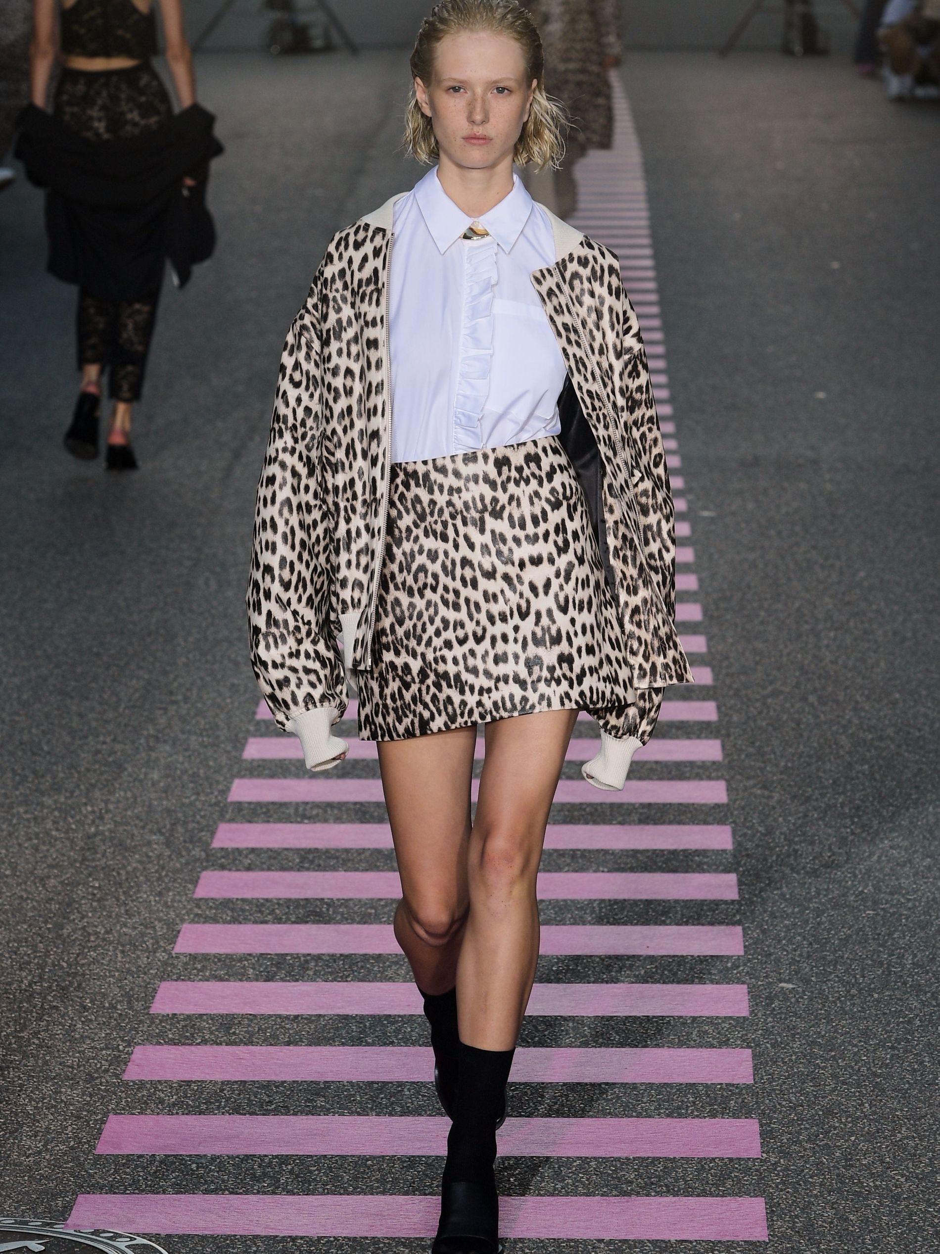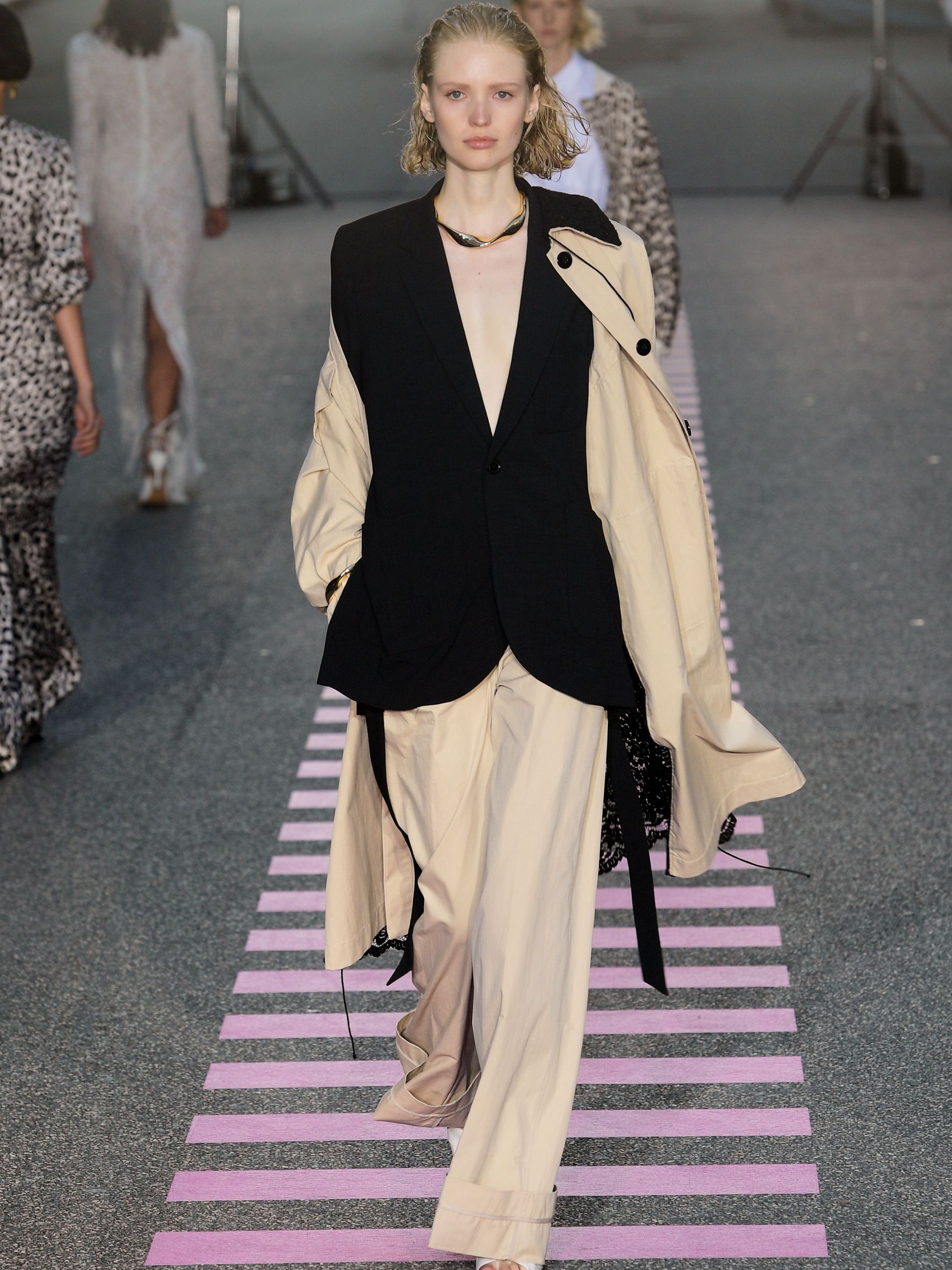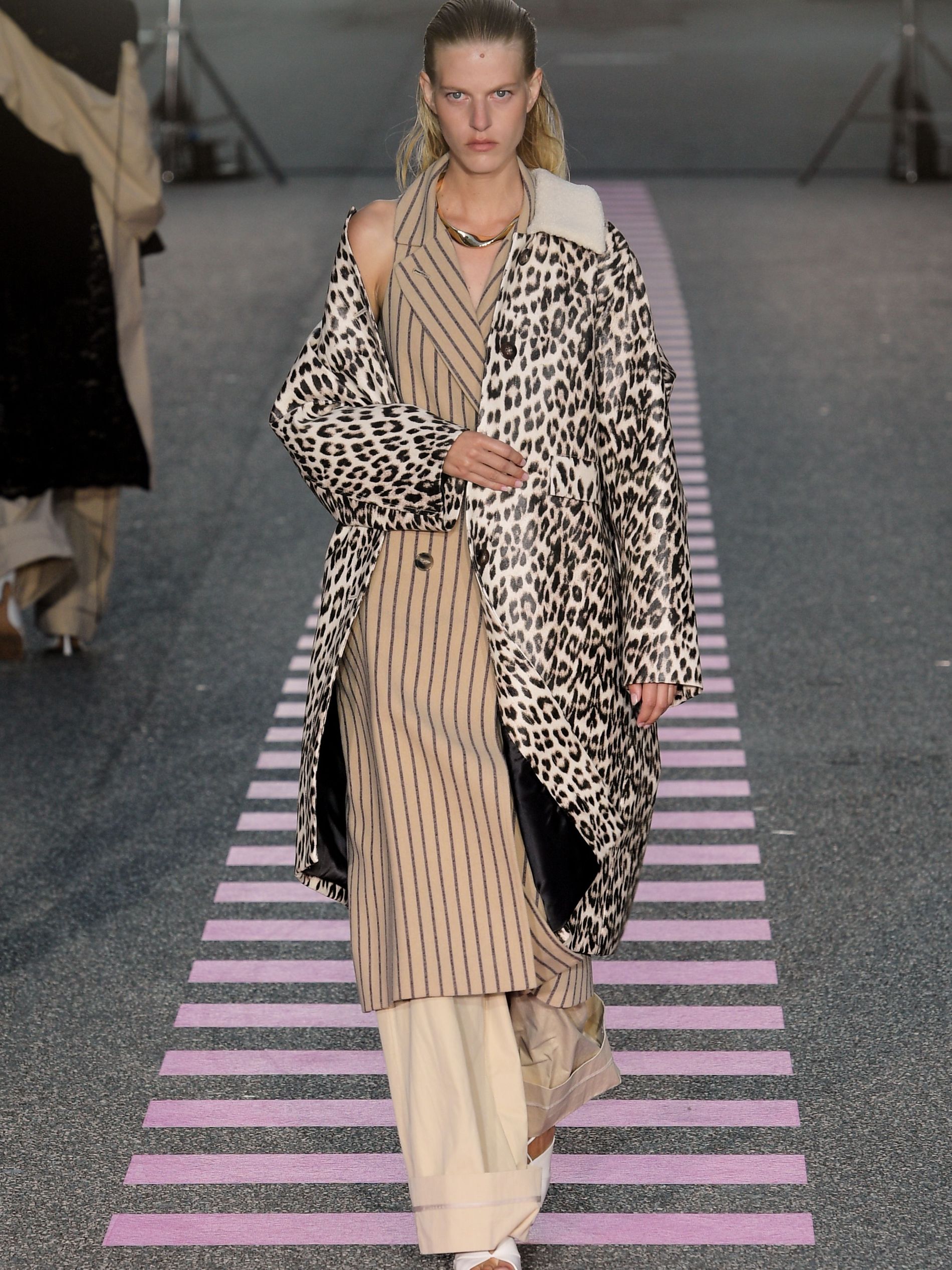 In a mash-mash of historicity, bright pink terry cloth sets with swimwear bottoms were spotted alongside a 1920s organza dress with puff sleeves and a reworked empire waist, covered by postage stamp emblems calling out “Coucou de Paris” ('Hello from Paris'). "We once dedicated a full collection to Charlotte Gainsbourg," Baumgarten and Hestehave said ahead of the show. "This season we thought of, what Charlotte Gainbourg would wear if she was a Gen Z kid. It would be timeless pieces but way more bold."