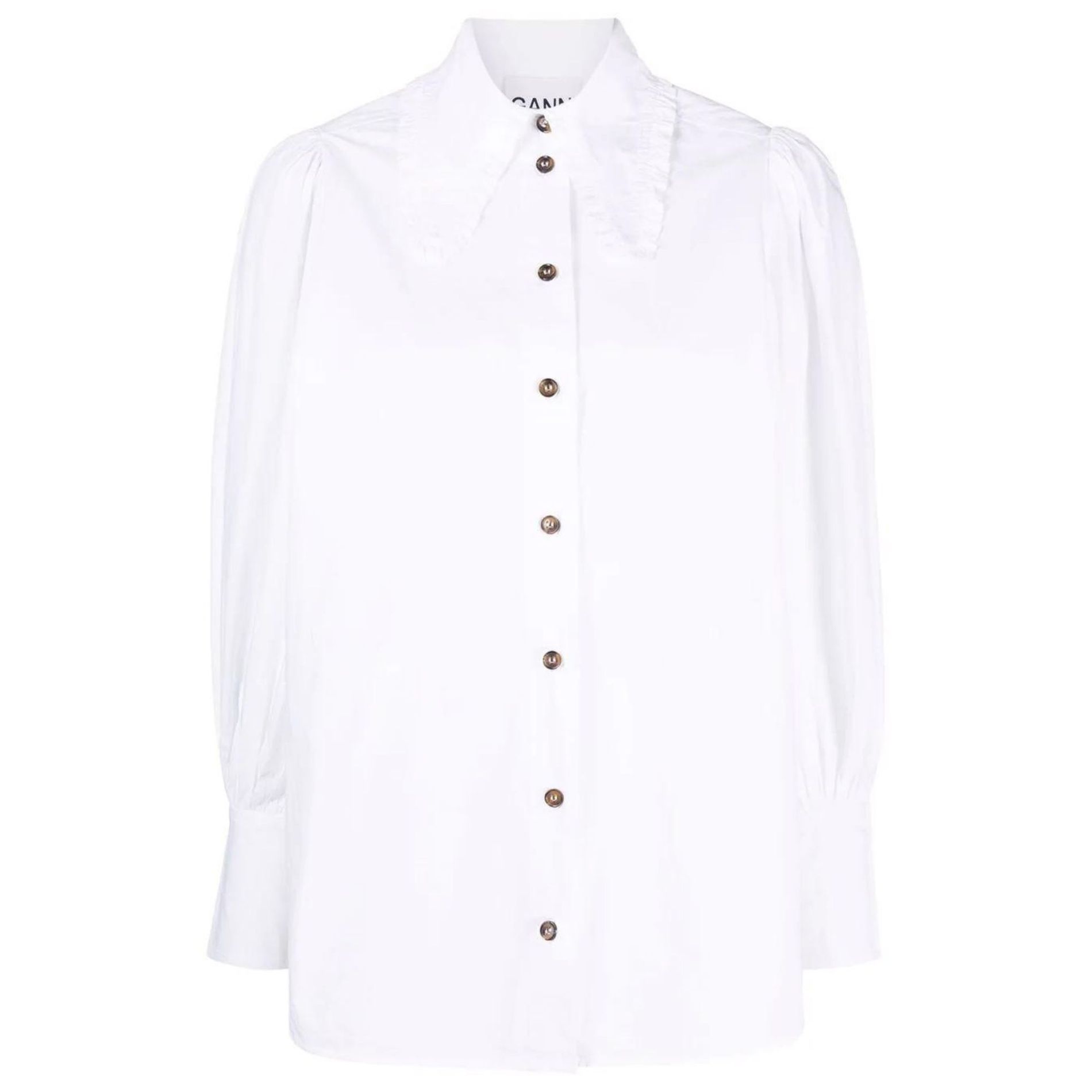 Ganni knows how to zhuzh up basics. Taking this traditional silhouette, for example, the Danish brand adds a ruffle to the collar and contrasting buttons to break with tradition.