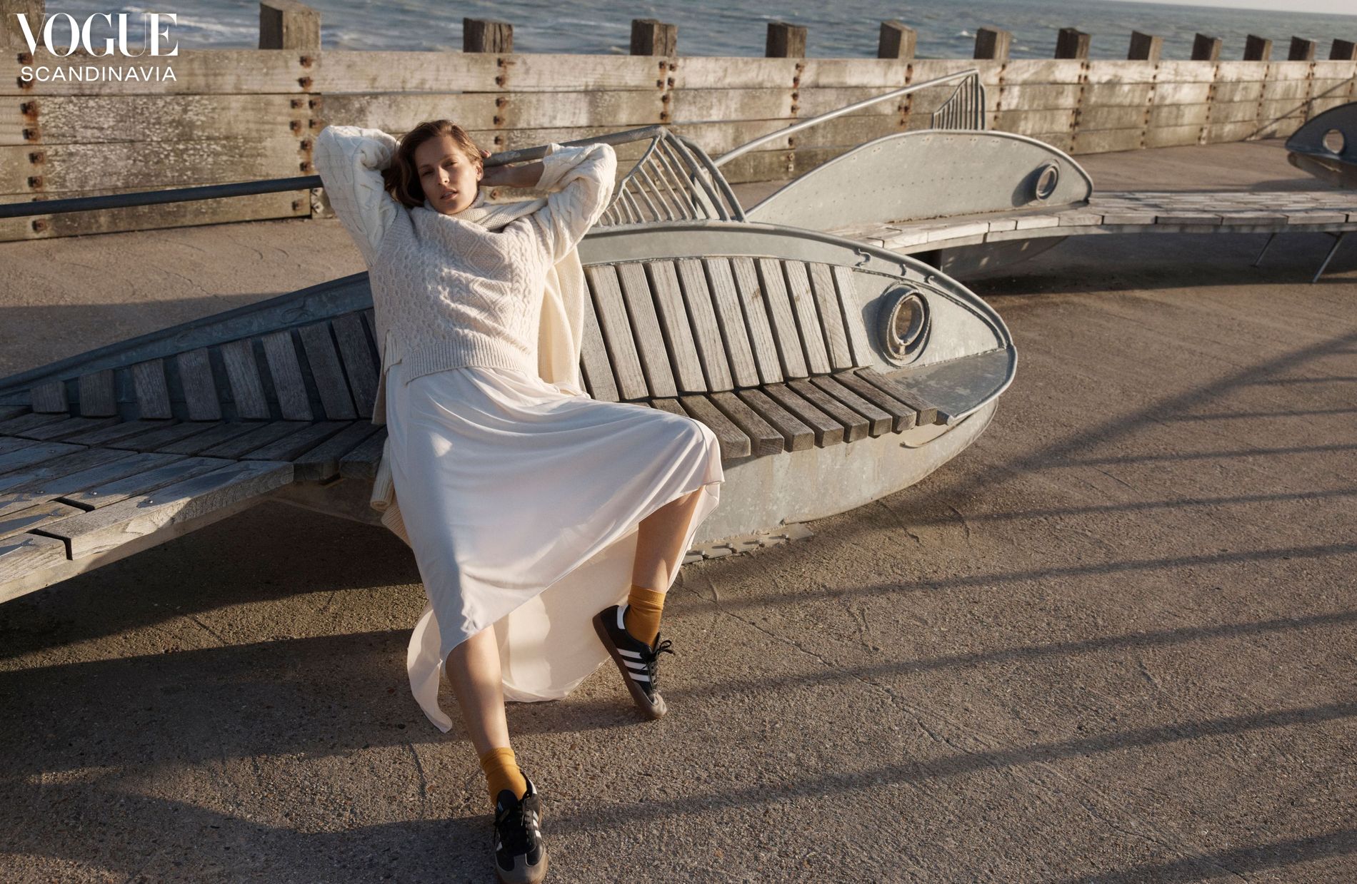 From Vogue Scandinavia's December 2022 - January 2023 issue. Knitted wool jumper, €550. House of Dagmar. Drape dress, price on request. Loewe. Wool shawl, €540. Toteme. Merino wool socks, €21. Falke. Trainers, €86. Adidas. Photo: Amie Milne