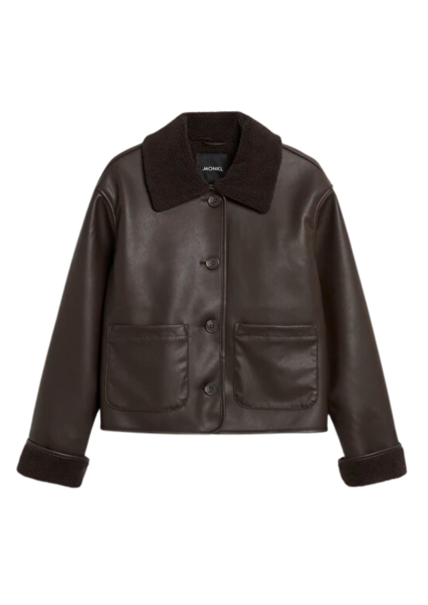 Sometimes, our lather jacket fix is best met with faux fabrics; for this purpose, we pound on Monki. An updated aviator with a straight fit and a corduroy collar, this piece comes in the most coveted colour of the season: Chocolate brown.