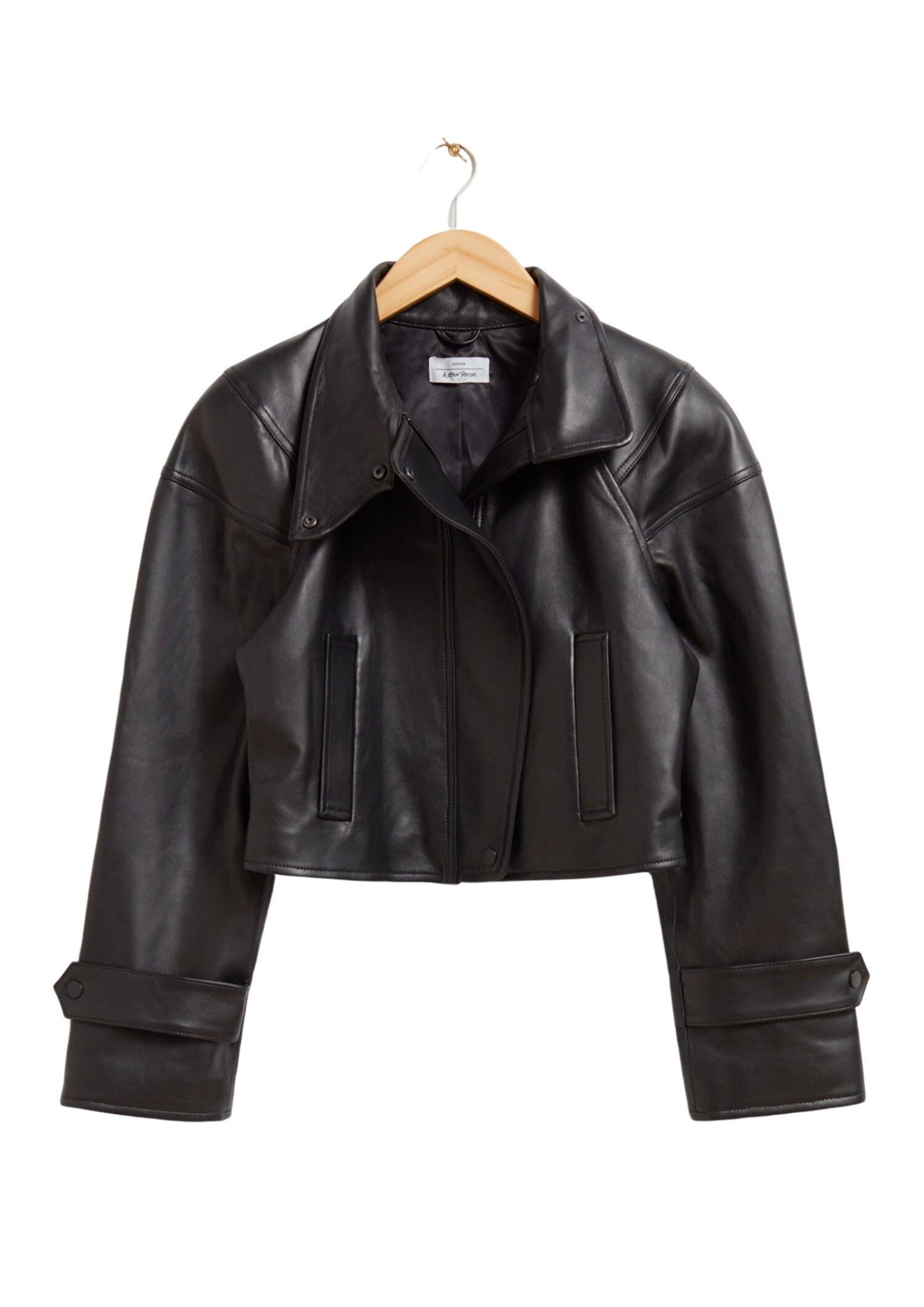 For modern appeal, & Other Stories cropped leather jacket Featuring classic moto details with a monochromatic appeal should not be overlooked. That said, you better act fast. This is a limited edition release, after all.