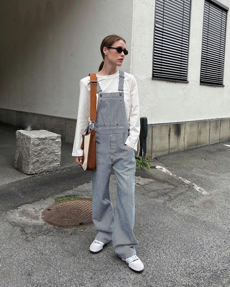 Looking to the runways, overalls are cropping up on the autumn/winter runways. At Isabel Marant, a trio of leather dungarees worn with chunky knit sweaters or a matching leather bomber walked down the runway. Danish power-house Ganni showed a striped overall with a black long-sleeved turtleneck top with dainty bow-embellished flats.