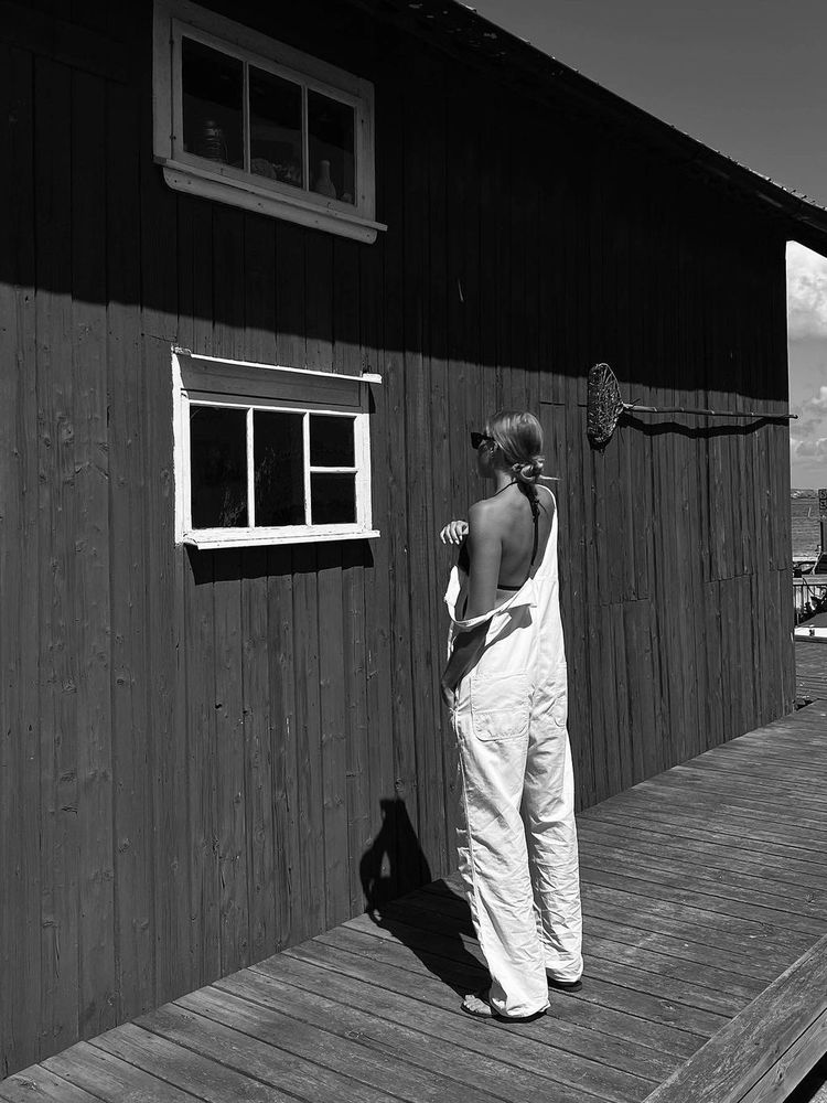 Swedish content creator Ellen Claesson wears white dungarees with a black swimsuit. Photo: @ellenclaesson